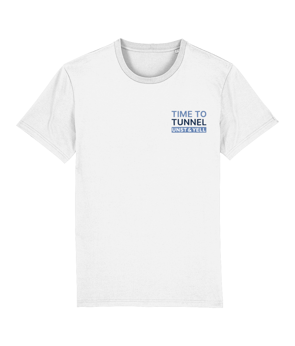 Unisex t-shirt, with two-sided design. Made from 100% organic combed ring-spun cotton. Unst and Yell Tunnels logo to front, time to tunnel hourglass design to…