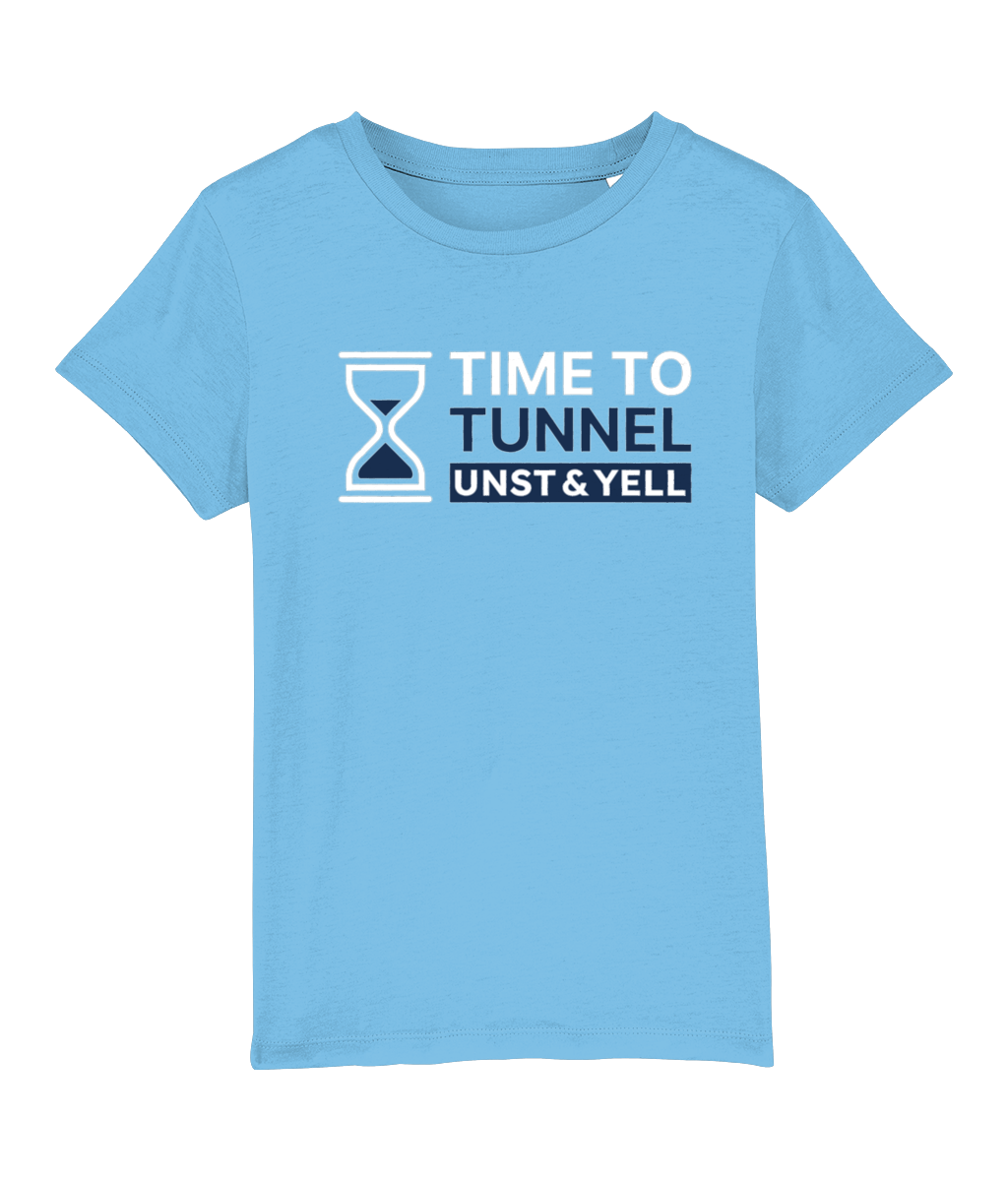 Unisex t-shirt, with two-sided design. Made from 100% organic combed ring-spun cotton. Unst and Yell Tunnels logo to front, time to tunnel hourglass design to reverse.