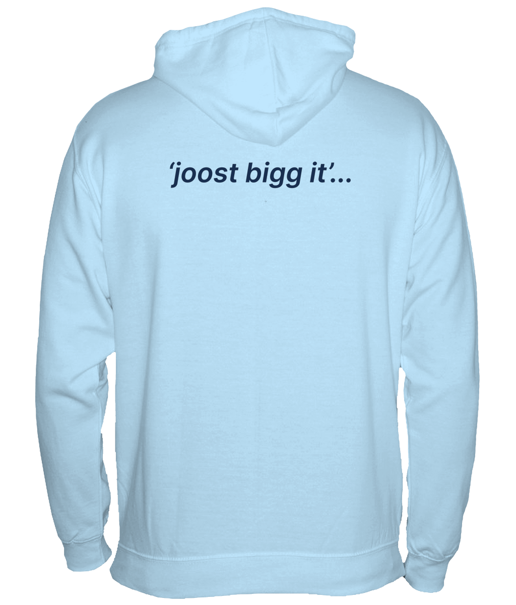 Cozy and durable children’s hoodie made from soft cotton-poly blend. Classic fit with kangaroo pocket and safety-compliant hood. ‘Joost bigg it…’ design on reverse.