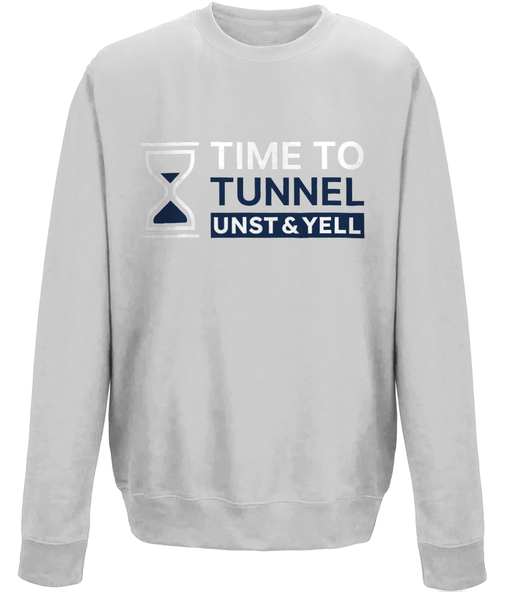 Soft and durable crew neck sweatshirt for children. Made from ringspun cotton blend with a brushed fleece inner and ribbed cuffs. Unst and Yell Tunnels logo…
